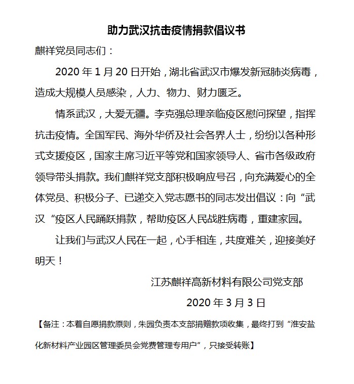 疫情當(dāng)前,愛心無限。2020年3月3日,是麒祥集團(tuán)全面復(fù)工的第二天,董事長姚翔同志和江蘇麒祥高新材料有限公司黨支部書記彭華龍同志即號召集團(tuán)全體黨員、積極分子,并帶頭為支持新冠肺炎疫情防控工作捐款,充分發(fā)揮黨員模范作用,以實(shí)際行動踐行初心使命,為打贏疫情防控阻擊戰(zhàn)貢獻(xiàn)力量。