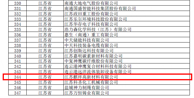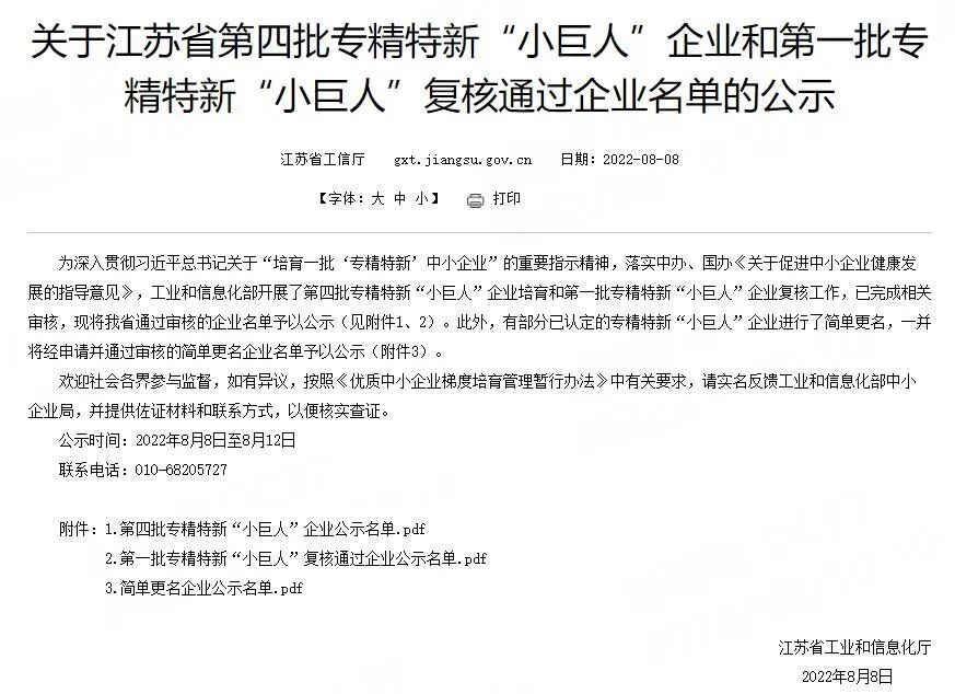2022年8月8日,工信部委托江蘇省工信廳公示了第四批專精特新“小巨人”企業(yè)名單,麒祥新材料下屬子公司江蘇麒祥高新材料有限公司成功入選,榮獲專精特新“小巨人”稱號(hào),實(shí)現(xiàn)了淮安工業(yè)園區(qū)專精特新“小巨人”企業(yè)零的突破。