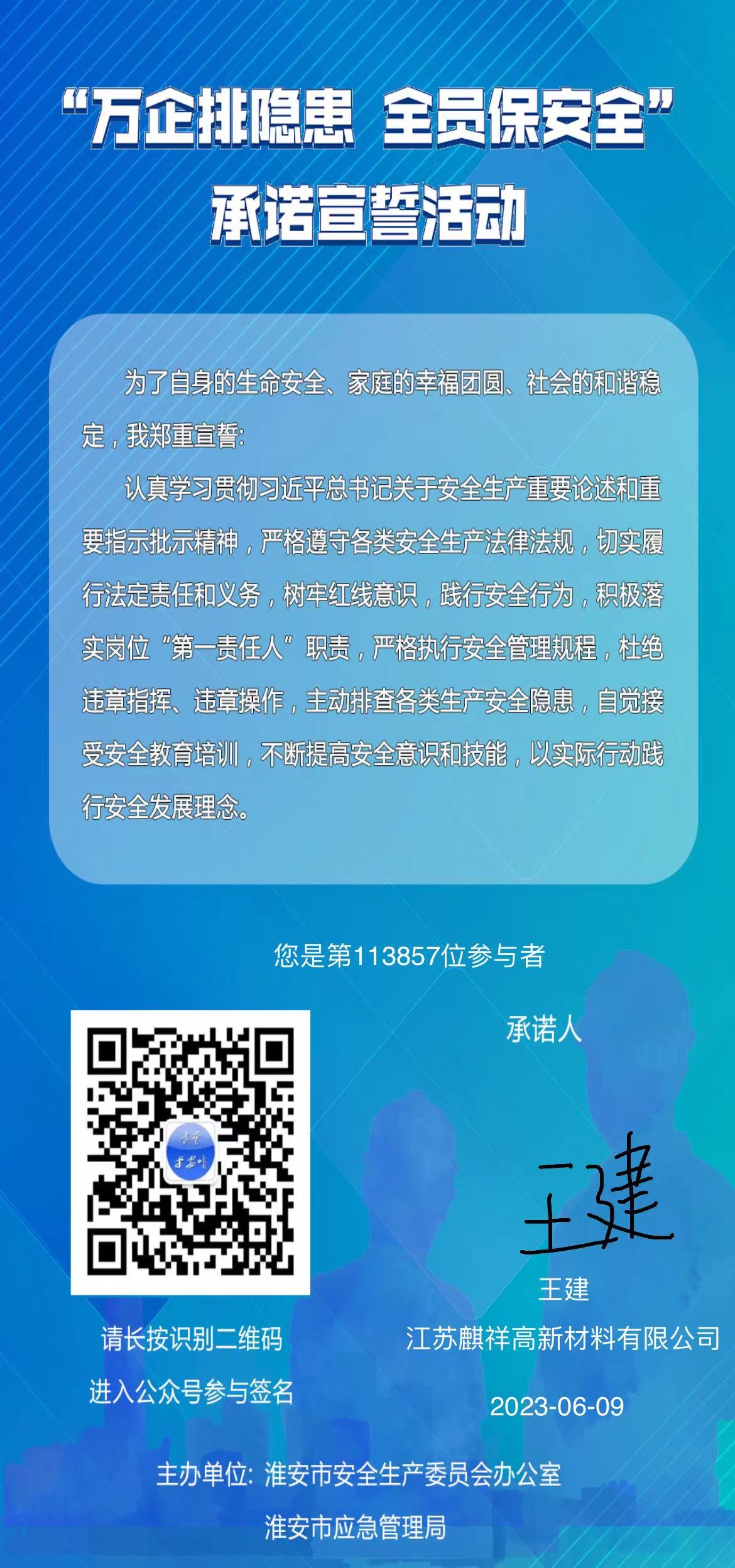一是線上承諾,線下宣誓。江蘇麒祥通過線上線下相結(jié)合的方式,利用微信公眾號“古楚平安哨”線上開展“安全承諾簽名”,進(jìn)一步提升公司各層各級員工安全意識、壓實安全責(zé)任。